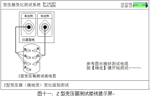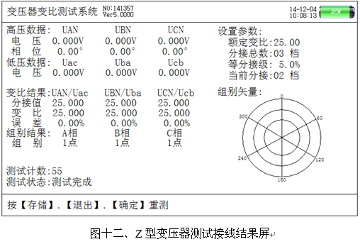 進行Z型變壓器測試之前應先進行參數設置,設置好各參數后按【退出】鍵回到主界面選擇“Z型變壓器"測試項按【回車】鍵進入接線圖屏(如圖十一所示),按照圖示要求接線,接線完成后按【回車】鍵進入“Z型變壓器"測試屏,儀器開始自動進行測試,測試完畢后顯示測試結果屏。提示行及測試結果屏如圖十二所示。