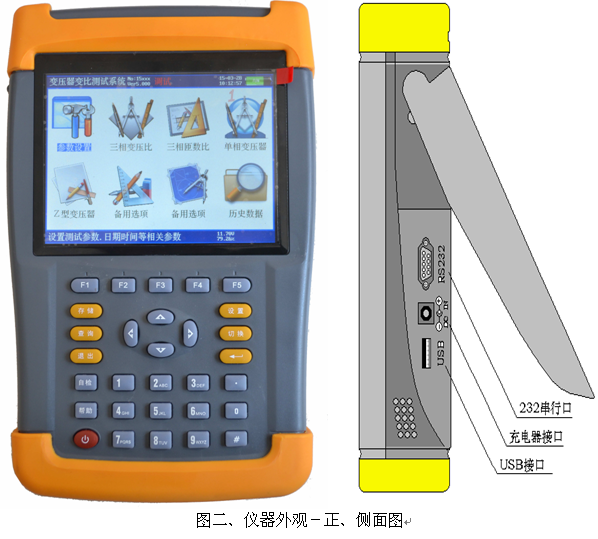 儀器頂端部分是變比測試航空插頭,高壓側,低壓側端子。正面上部是彩色液晶屏,下部是標準30鍵的控制鍵盤;在儀器的右側打開支架可看到USB接口、充電接口、RS232接口。