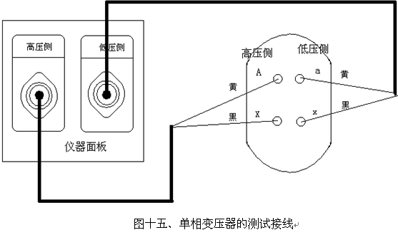 2.單相測量時,儀器高壓側的黃、黑兩根線分別接單相變壓器高壓側的A,N,儀器1#低壓側的黃、黑兩根線分別接變壓器低壓側的a、n,接線正確方可測試。接線圖如下圖所示: