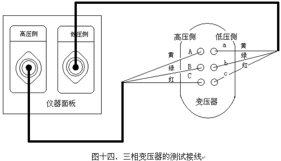 1.三相測量時,儀器高壓側的黃、綠、紅三根線分別接變壓器高壓側的A、B、C,儀器1#低壓側的黃、綠、紅三根線分別接變壓器低壓側的a、b、c,接線正確方可測試。接線圖如下圖所示: